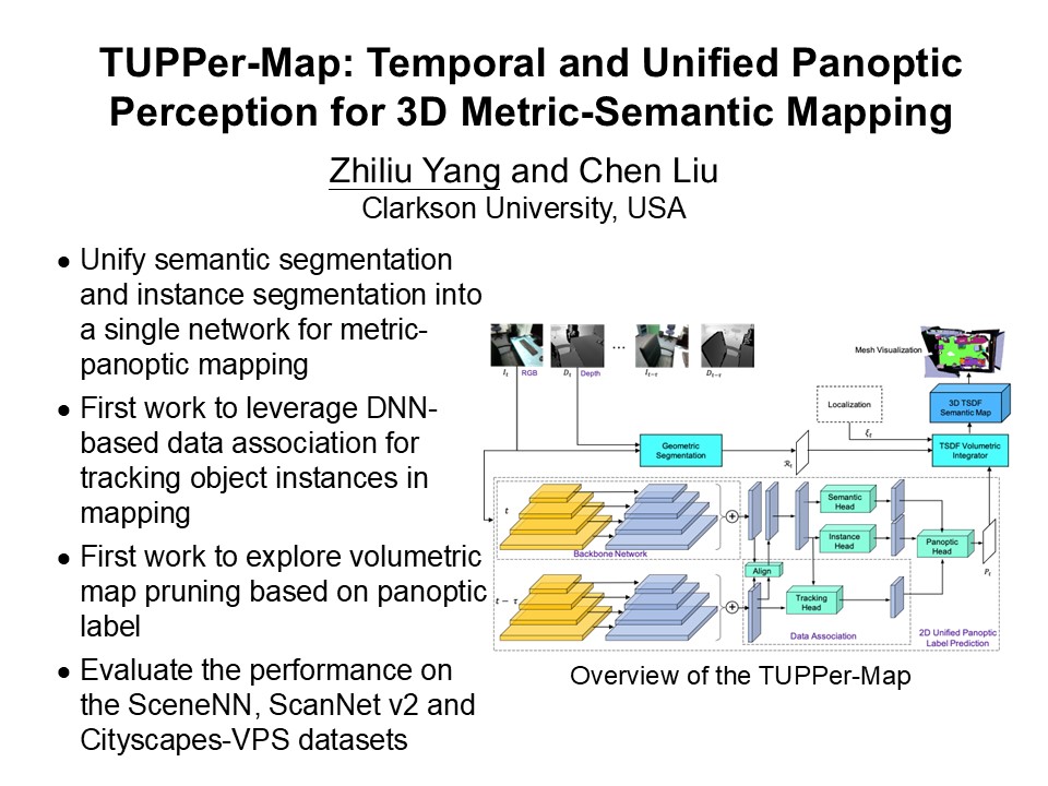 Abstract: In this paper, we propose TUPPer-Map, a metric-semantic mapping framework based on the unified panoptic segmentation and temporal data association. In contrast to the previous mapping method, our framework integrates the data association stage into the holistic pixel-level segmentation stage in an end-to-end fashion, taking advantage of both intra-frame and inter-frame spatial and temporal knowledge. Firstly, we unify two-branch instance segmentation network and semantic segmentation network into a single network by sharing the backbone net, maximizing the 2D panoptic segmentation performance. Next, we leverage geometric segmentation to refine the segments predicted via deep learning. Then, we design a novel deep learning based data association module to track the object instances across different frames. Optical flow of consecutive frames and alignment of ROI (Region of Interest) candidates are learned to predict the frame-consistent instance label. At last, 2D semantics are integrated into 3D volume by TSDF raycasting to build the final map. We evaluated the performance of our framework extensively over the SceneNN, ScanNet v2 and Cityscapes-VPS datasets. Our experimental results demonstrate the superiority of TUPPer-Map over existing semantic mapping methods. Overall, our work illustrates that using learning based data association strategy can enable a more unified perception network for 3D mapping.